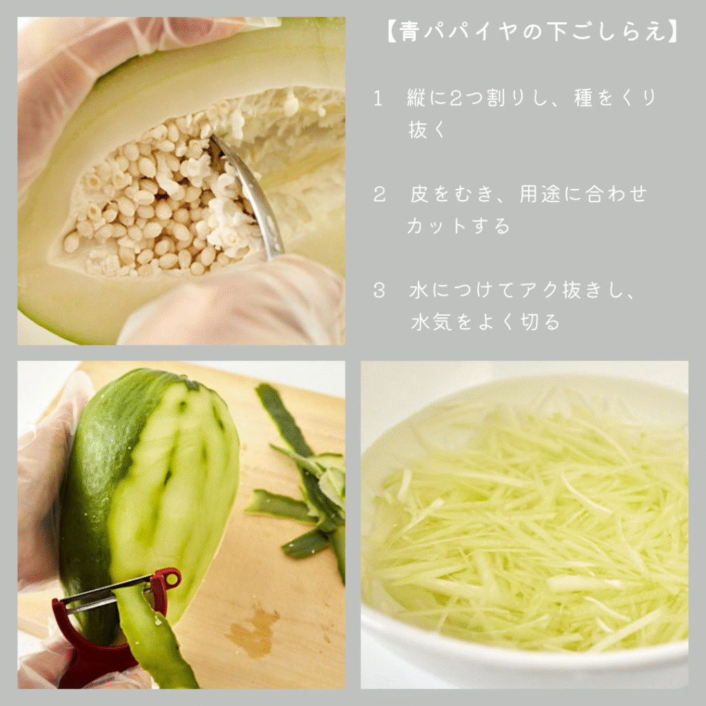 青パパイヤはそのまま食べるとエグみが強いため、水にさらしてアク抜きをしてから調理します。